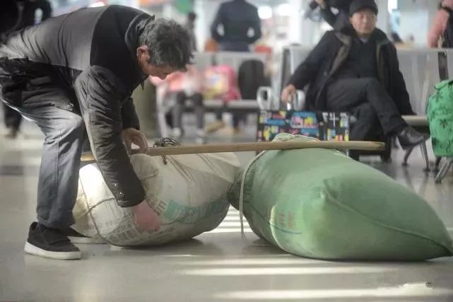 【蛇皮袋】2017年1月16日,江苏扬州,2017年春运进入第4天,在扬州汽车站,人潮拥挤的“春运大军”中,返乡旅客各显神通,各种春运“神器”再现,扁担,塑料桶,蛇皮袋,帆布包等成为大部分民工携带春运必须物品的“春运神器”,成为旅途中一道独有的风景线。孟德龙/摄