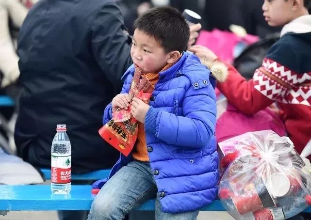 【零食】2017年1月24日,四川成都,2017年春运,成都市火车北站,春运火车北站候车室,一名小孩在吃东西。成都商报张士博/摄