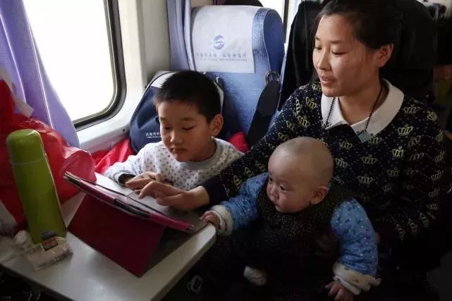 【平板】2015年2月5日,2015年春运第二天,记者登上由聊城开往东营的K8305次列车体验式采访,记录春运旅途。赵子云怀抱6个月的宝宝与大儿子石圣荣在K8305次列车玩平板电脑。郭志华/摄