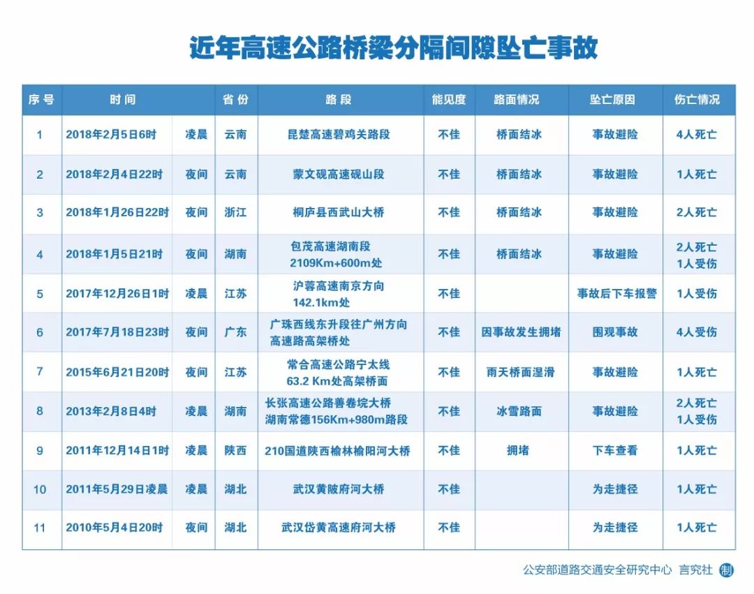 近日来,云南连续发生驾乘人员在紧急避险时从高速公路桥梁中央分隔带间隙坠亡的事故,令人十分心痛。但近年来,同类事故却屡屡发生,其中反映出的问题值得高度关注。交通言究社从各地公安交管部门及媒体报道中采集了11起典型案例,并进行了简要分析,供大家参考。
