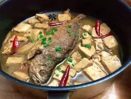 黄鱼2条、豆腐200克、葱、姜、蒜适量、干红辣椒4-5根、淀粉少许、料酒、酱油、醋适量、盐、白糖少许。