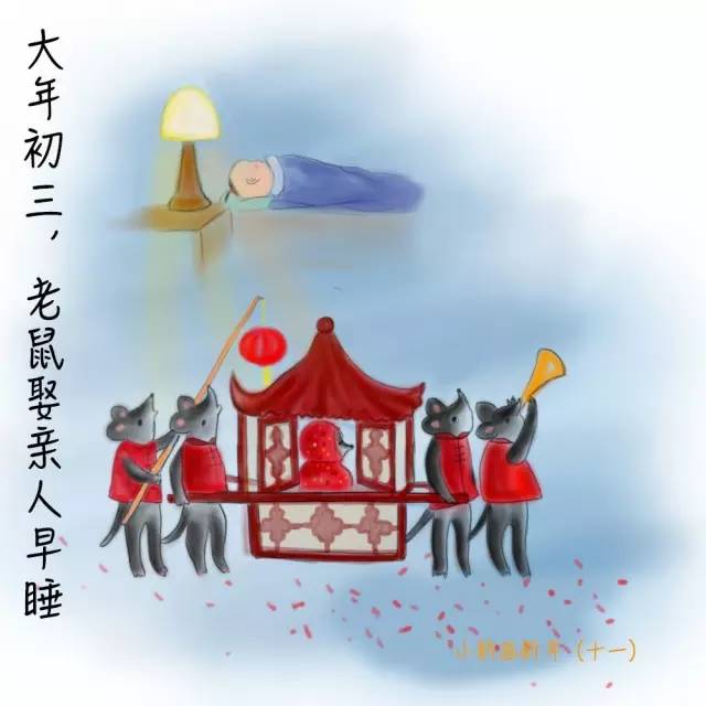 民间亦传说初三晚上就是“老鼠娶亲(嫁女)”的日子,所以一般人家都早早熄灯睡觉,以免骚乱了鼠辈(也有人说入夜提早熄灯是为了让老鼠看不见,无法娶亲,以减少其繁殖的速度),并在屋角洒落一些米粒、糕饼,供老鼠食用,称为“老鼠分钱”,表示和老鼠共享一年的丰收。