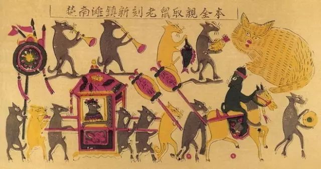 不管南方北方,一到春节,小老鼠们吹吹打打娶亲嫁女的剪纸就出现在家家户户的墙上窗上。国家非物质文化遗产保护专家委员会委员徐艺艺说:“老鼠的繁殖力很强,‘老鼠嫁女’题材的剪纸、年画反映了农耕社会的生殖崇拜,老百姓借此祈求多子多福。”