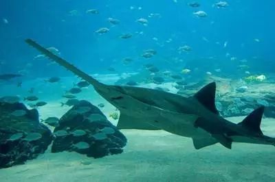 锯鳐头、体长而平扁,吻延长,边缘有坚硬锯齿的剑状突出物,也就是我们形象称之的“锯子”。体长可达5.5米,最大者为7米,其中“锯子”就能占到1.7米左右。典型的身高不够,“锯子”来凑吗?
