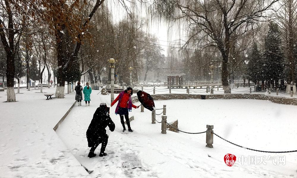 7日10时,朝阳市区一处公园内,市民在雪中拍照。(图/文 王优 马东雷)