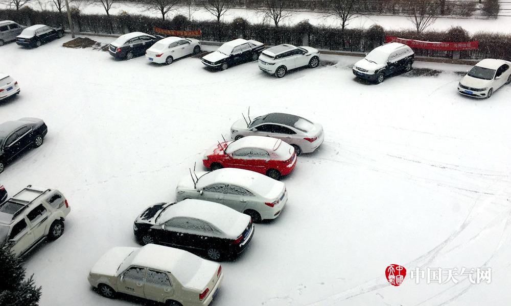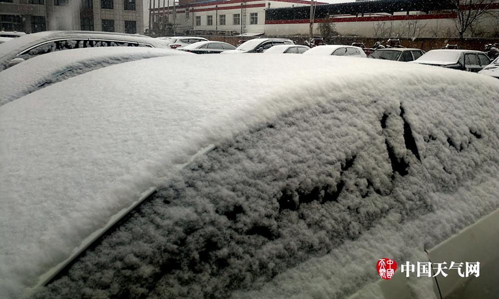 7日9时30分,朝阳龙城区降雪逐渐增强,地面和车辆被雪覆盖。(图/文 暴晓飞 马东雷)