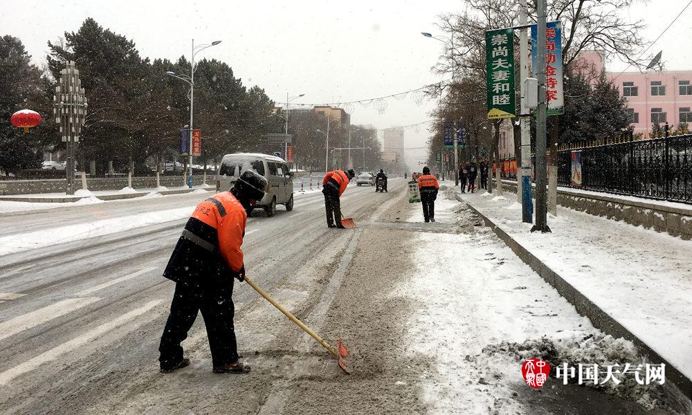 7日12时30分,朝阳北票市区环卫工人正在清扫道路积雪。(图/文 宋欣 马东雷)