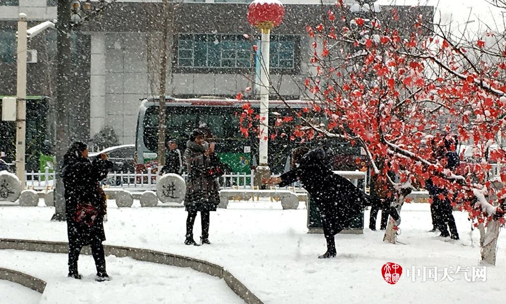 7日上午,辽宁朝阳迎入冬以来首场明显降雪,许多市民来到户外欣赏雪景并拍照留念。据气象部门监测统计显示,朝阳地区自去年10月中下旬入冬以来,一直没有明显降雪过程出现,朝阳市区降水量几乎为零,这也是自1951年以来,全市降水量最少的一年。(图/文 王优 马东雷)