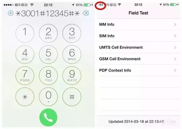 苹果手机:拨号键盘输入*3001#12345#* ,点击呼叫按钮,左上角出现的负数就是你的手机信号强度。