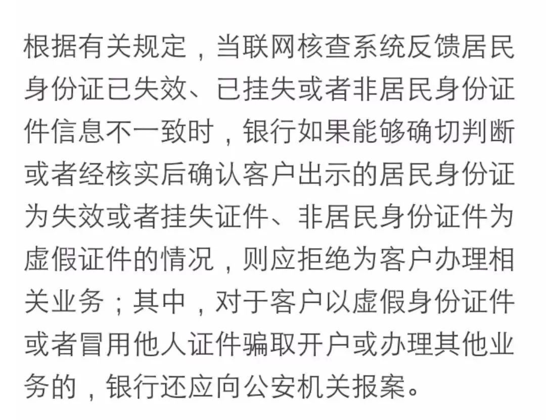 该负责人表示,当联网核查系统反馈居民身份证已失效或者挂失,或者非居民身份证件信息不一致时,银行将视实际情况决定是否为客户办理相关业务。