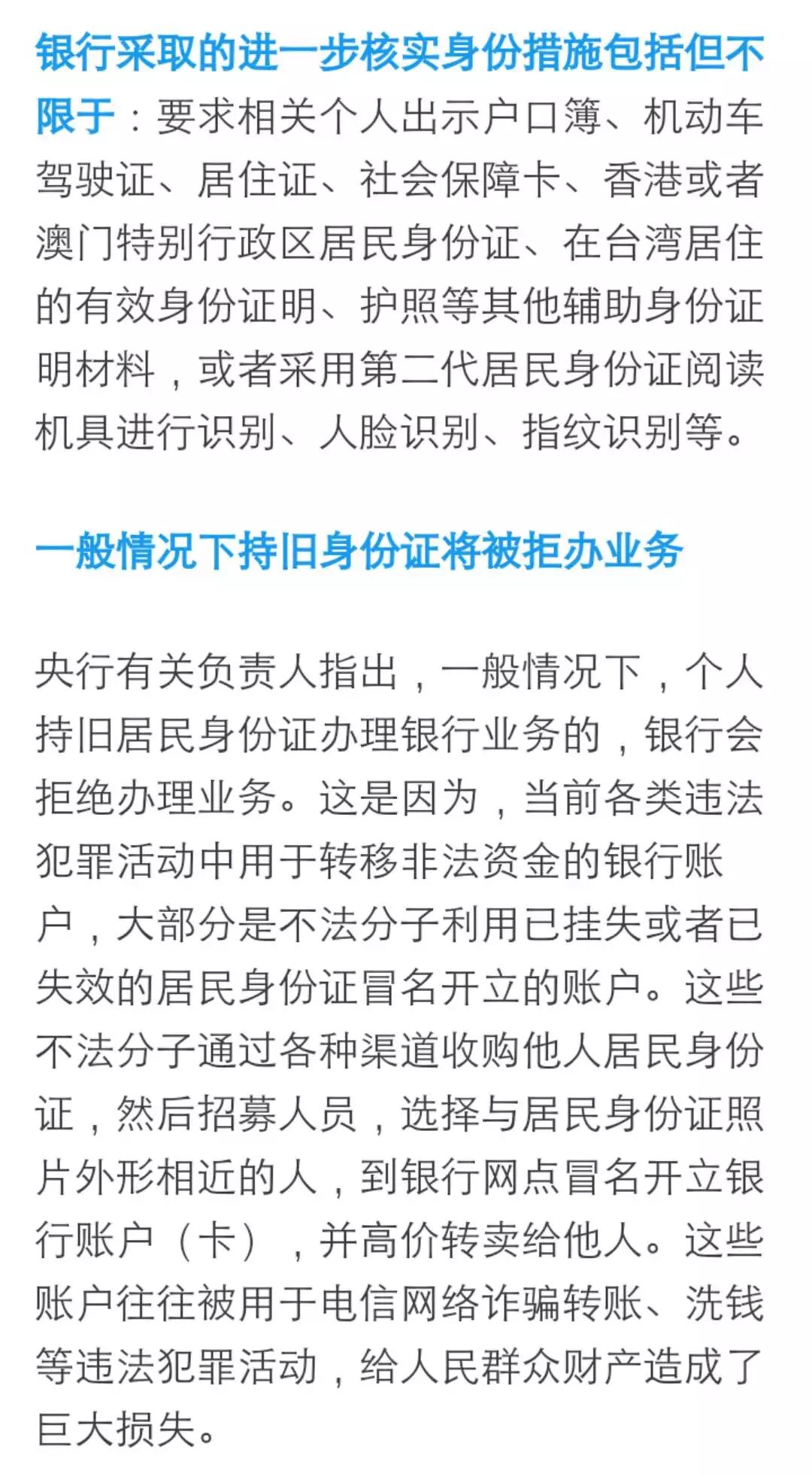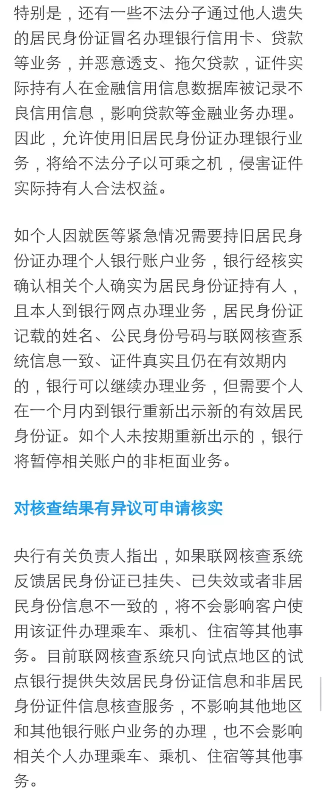 人民银行表示,针对近年来不法分子大量使用他人居民身份证、伪造变造非居民身份证件等,冒名开立银行账户、转移非法资金的问题,在现有联网核查居民身份证信息工作基础上,进一步扩大核查信息范围,组织开展失效居民身份证信息,以及港澳居民来往内地通行证、台湾居民来往大陆通行证、外国人永久居留身份证(统称非居民身份证件)信息核查试点工作。