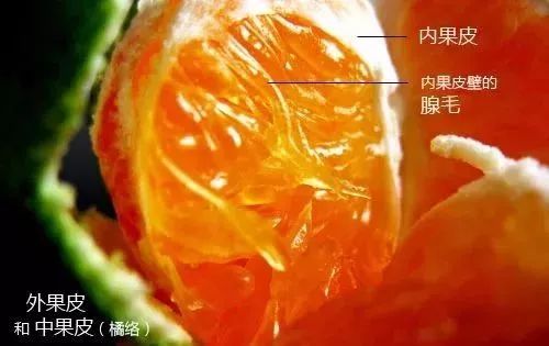 所谓的“橘子皮”其实包含着外、中两层果皮。子房外壁发育成的外果皮依然担当着外皮的角色,只不过多了许多油细胞参与其中。