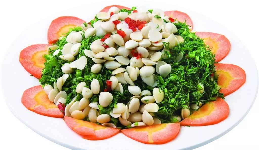 做法:甜杏仁用水煮十分钟。茴香菜切碎,加入甜杏仁,以2:1的比例放入酱油和醋拌匀就可以了。