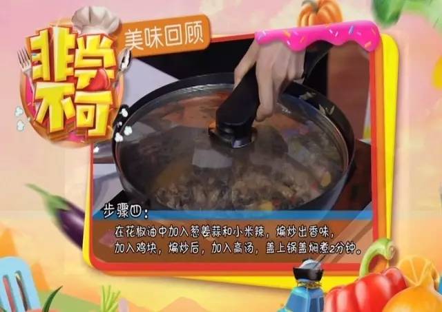 第四步:在花椒油中加入葱姜蒜和小米椒,煸出香味,加入鸡块。煸炒后加入高汤,盖上盖锅盖儿闷煮2分钟。