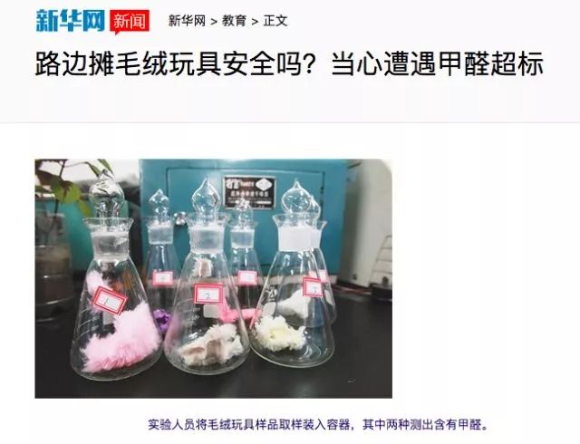 2017年,新华社曾针对街边的毛绒玩具,做过一次取样化验。结果发现:采样回来的5个没有3c标志的娃娃中有一半都甲醛超标!