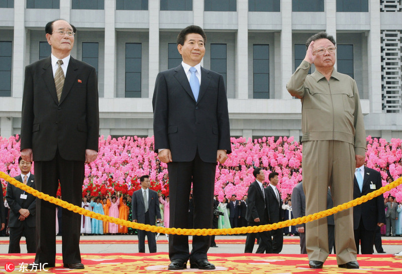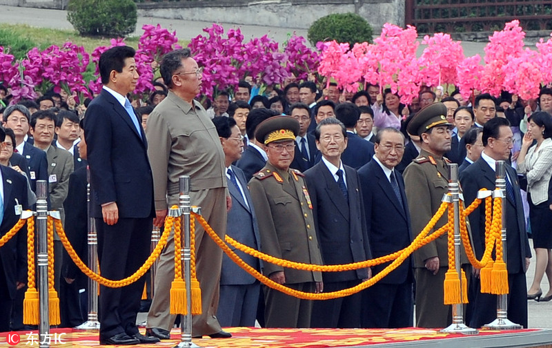 当地时间2007年10月,朝鲜平壤,时任韩国总统卢武铉和朝鲜领导人金正日会晤。卢武铉检阅仪仗队。
