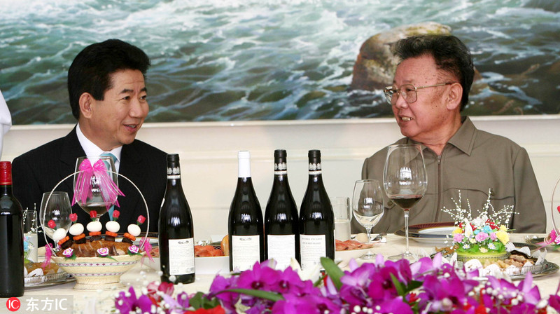 当地时间2007年10月,朝鲜平壤,时任韩国总统卢武铉和朝鲜领导人金正日会晤。