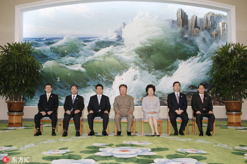 当地时间2007年10月,朝鲜平壤,时任韩国总统卢武铉(中)和朝鲜领导人金正日(右一)会晤。