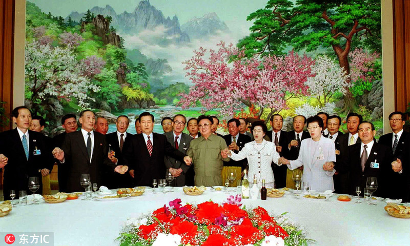 当地时间2000年6月,朝鲜领导人金正日和韩国总统金大中会晤。