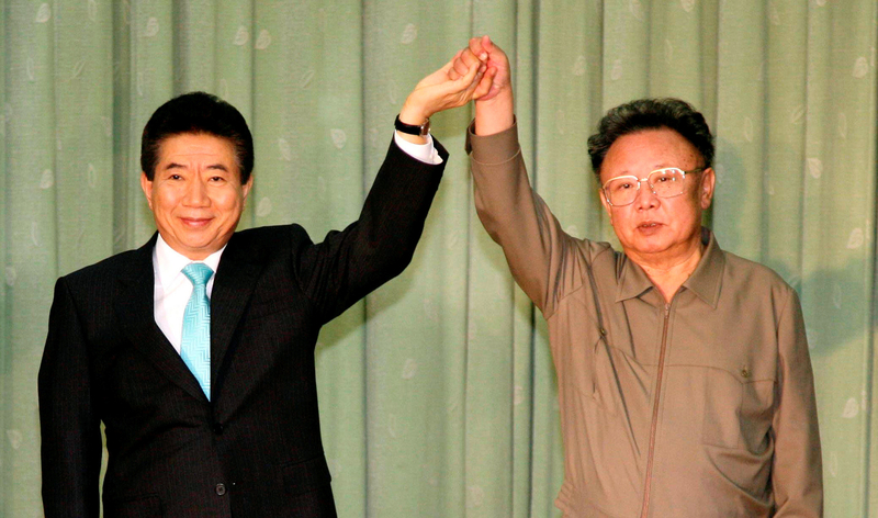 当地时间2007年10月,朝鲜平壤,来访的韩国总统卢武铉与朝鲜领导人金正日(右)