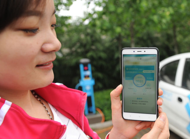 5月8日,准备用车的市民查看共享汽车充电状况。新华社发:(陈晓霞摄)
