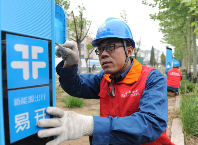 5月8日,国网山东青州市供电公司员工在共享汽车充电点排查充电桩供电安全。新华社发:(陈晓霞摄)