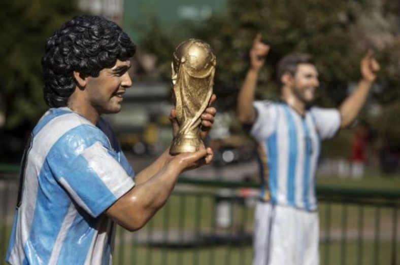 图为阿根廷布宜诺斯艾利斯阿尔韦亚尔市长广场马拉多纳(左)和梅西的雕像,新华社发(马丁·萨巴拉 摄)