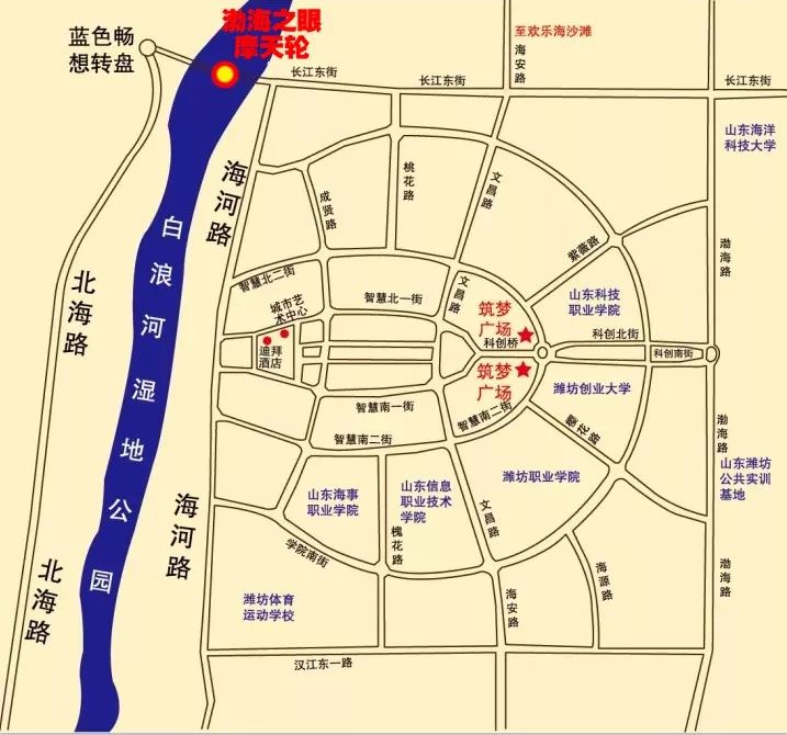 白浪河大桥摩天轮采用桥梁与摩天轮结合的形式,横跨白浪河,大桥全长540米,摩天轮矗立大桥中央,直径125米,总高度145米,有36个轿厢,每个轿厢能够坐8到10人,运行一周约需30分钟。