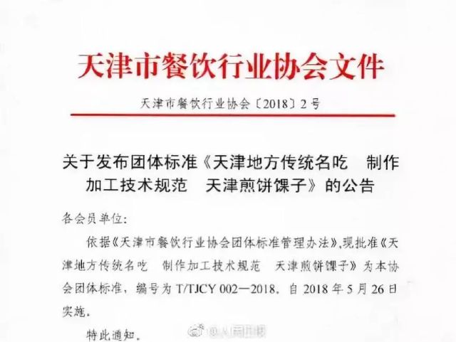 该协会批准了《天津市地方传统名吃 制作加工技术规范 天津煎饼果子》,于5月26日起实施。