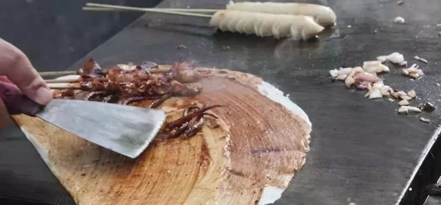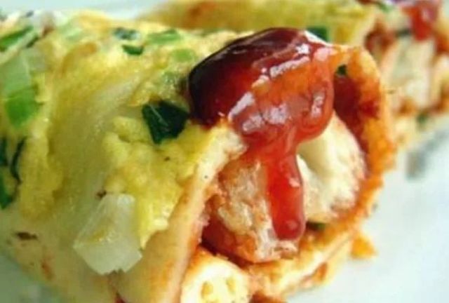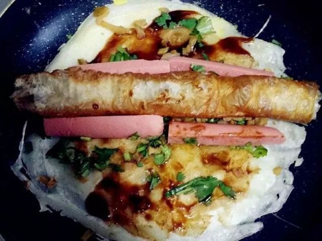 传统煎饼是一层薄饼夹油条,但有些地方,也会加火腿、鱿鱼,甚至海参……