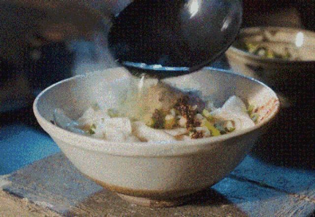 ➤煮面时要有三次“biang”声,下入沸水中(在案子上的声音有biangbiang声,在空中落到锅里的声音有biangbiang声,在锅里煮的声音有biangbiang声)。