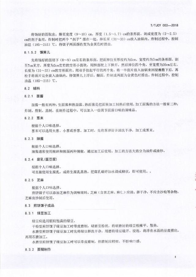 这份标准规定了天津煎饼馃子的术语与定义、原、辅料要求、制作场所及设备要求、加工过程卫生及人员要求、制作工艺要求、标识、包装、运输与贮存等内容。