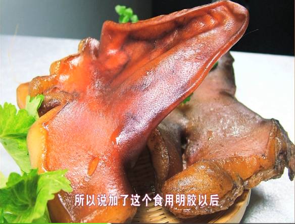 大家都知道,猪耳外面是富含胶原蛋白的猪皮,里面有一层脆骨,因而吃起来嘎嘣脆,就是脆而不腻。人造猪肉可能是用明胶和塑料做成的。跟真的猪耳比起来,人造猪耳朵颜色可能更加透亮,卖相好。