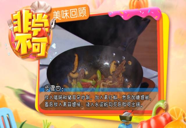 步骤四:放入腊肠和猪耳朵炒制,加入青红椒,然后加糖提鲜,最后放入青蒜提味,浇入水淀粉勾芡后即可出锅。