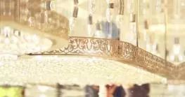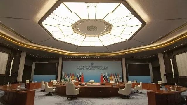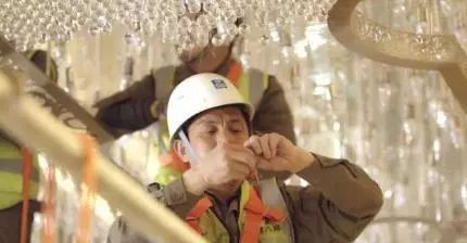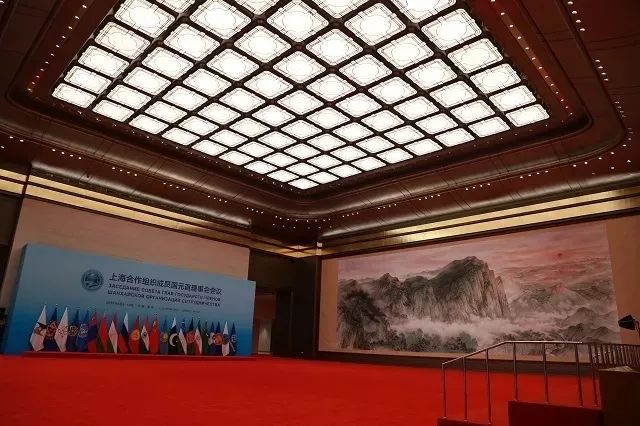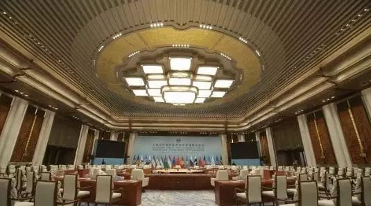 “重台勾阑尚合亭,甘泉汇海八方贤”。上合组织青岛峰会主会场的双边会议室、多功能厅,均为水晶吊顶,共计21万个水晶球,均由建设者一个一个手工挂吊上去。穿线、挂装,80个人、15天,成就了水晶灯的精致整齐、美轮美奂。