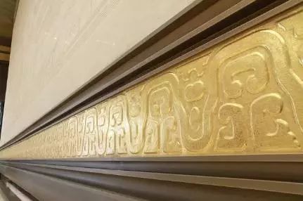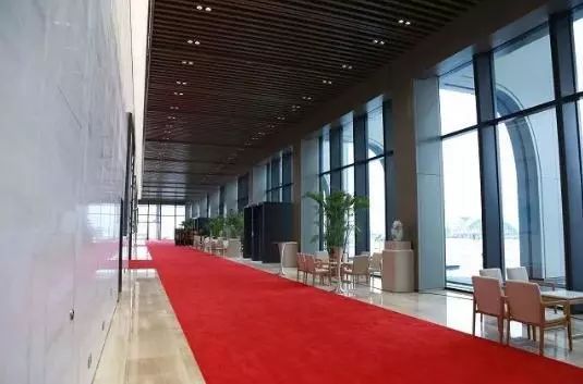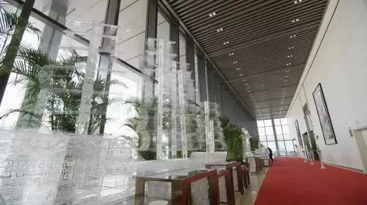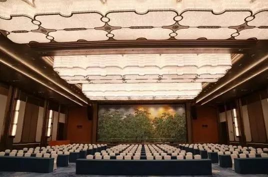 走进场馆的一层迎宾大厅,顶部暖色藻井发光天花,运用九为基数分隔,81块藻井,饰以图案,寓意九九归一。每块藻井重达560斤,全部由直径仅有8毫米的4根钢丝绳垂直吊起,再由8名工人推动脚手架,3名工人登上16米的屋顶安装。