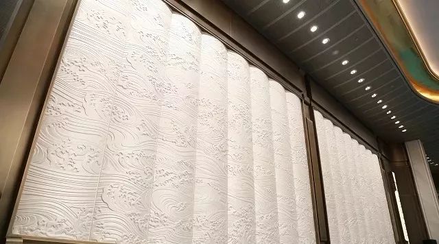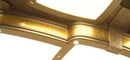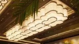 描金又称金画漆,起源于战国时期,是用金色描绘花纹的装饰方法。大范围会议室顶部灯具造型以“玉”为主体,名为“久合叠玉”,象征集合智慧、合力共赢、环环相扣、生生不息。而这些灯的描金装饰均由具备十年以上手工描金技艺的工匠一笔描成。