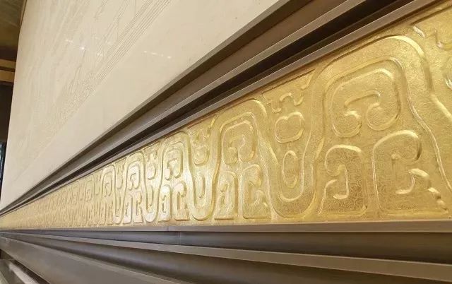 “锻打”技艺诞生于商周时期。在上合组织青岛峰会主会场的迎宾大厅及主会议厅内,饕餮纹的錾铜板就是用这项技艺全手工锻打而成。“锻打”工艺要10年的时间才能出徒,这些錾铜板全是具备20年经验的师傅敲击而成。这些拥有精美纹路的錾铜板虽有些不平整,却饱含建设者上万次“敲击”的匠心。