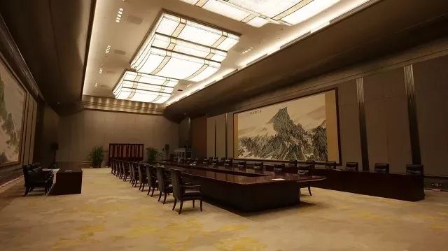 二层大会议厅是本案最重要的会议厅,以“义”为本,以 “殿”为体,以“人文”为表。用正义、情义、人间大义,以及孟子所讲的“浩然之气”来定义空间的精神。顶部圆形造型灯具以传统文化中的如意造型做为基础发展而成,寓意祥和,包容与交流。