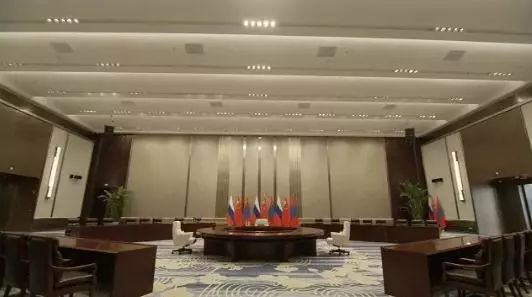 其次,每盏灯都为方形,代表着契合、安宁、稳固、安全和平等。是熟悉和值得信任的韵味,代表着秩序、理性和正式。突出会议仪式感的强烈。每盏灯中央的圆形代表着保护和无限,代表着诚信、交流、圆满和完整,暗示了团结、和谐。在圆弧的四个方向,弧线以同心圆的点向外扩散,与原有的圆弧形成了八个方向的意念,寓意汇聚八方,润泽天下。