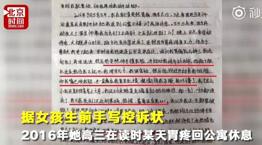 李先生手里保存着一份李某奕手写的“控诉状”,根据这份“控诉状”里的内容,2016年9月5日下午,李某奕突然胃疼,担心宿舍比较冷,学校一位老师安排李某奕去教师公寓休息。当晚8点30分左右,李某奕的班主任吴某厚进到教师公寓,坐在床边询问她的病情,李某奕回答“好多了”。吴某厚以探病为由亲吻、搂抱李某奕,因为另一位老师到来才停止。