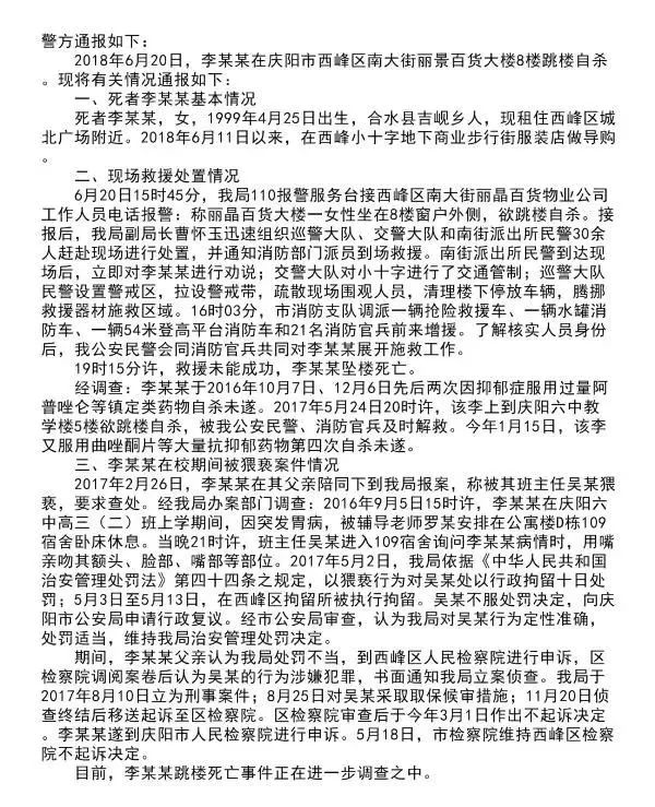 西峰区公安分局副局长曹怀玉介绍李某奕曾三次服药、一次跳楼自杀,均未遂,但本次轻生是否与两年前的教师猥亵案件有关,目前仍在调查中。
