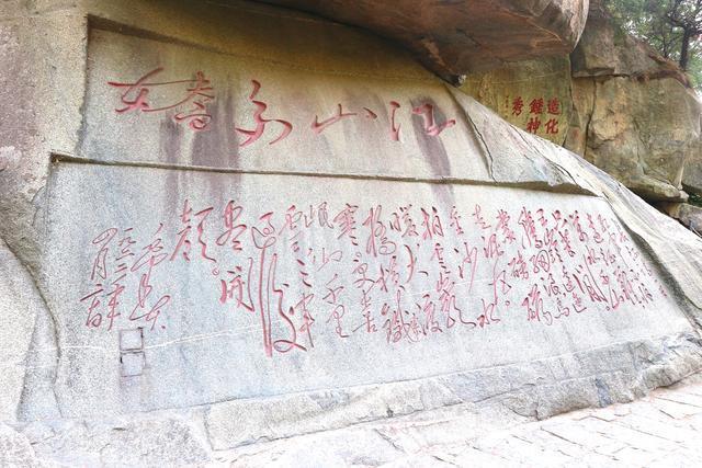 泰山中路“斩云剑”以北的盘路侧,你会看到镌刻着毛主席的《七律·长征》诗手迹的一处摩崖石刻。