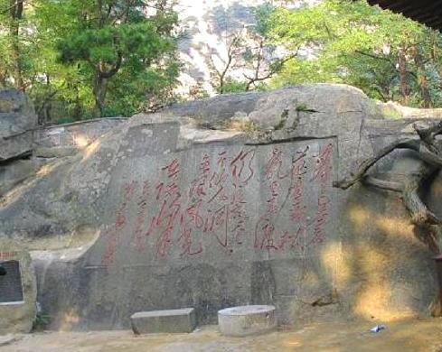 泰山朝阳洞登山路东侧,有根据毛泽东手书《题李进同志所摄庐山仙人洞照》的摩崖石刻。