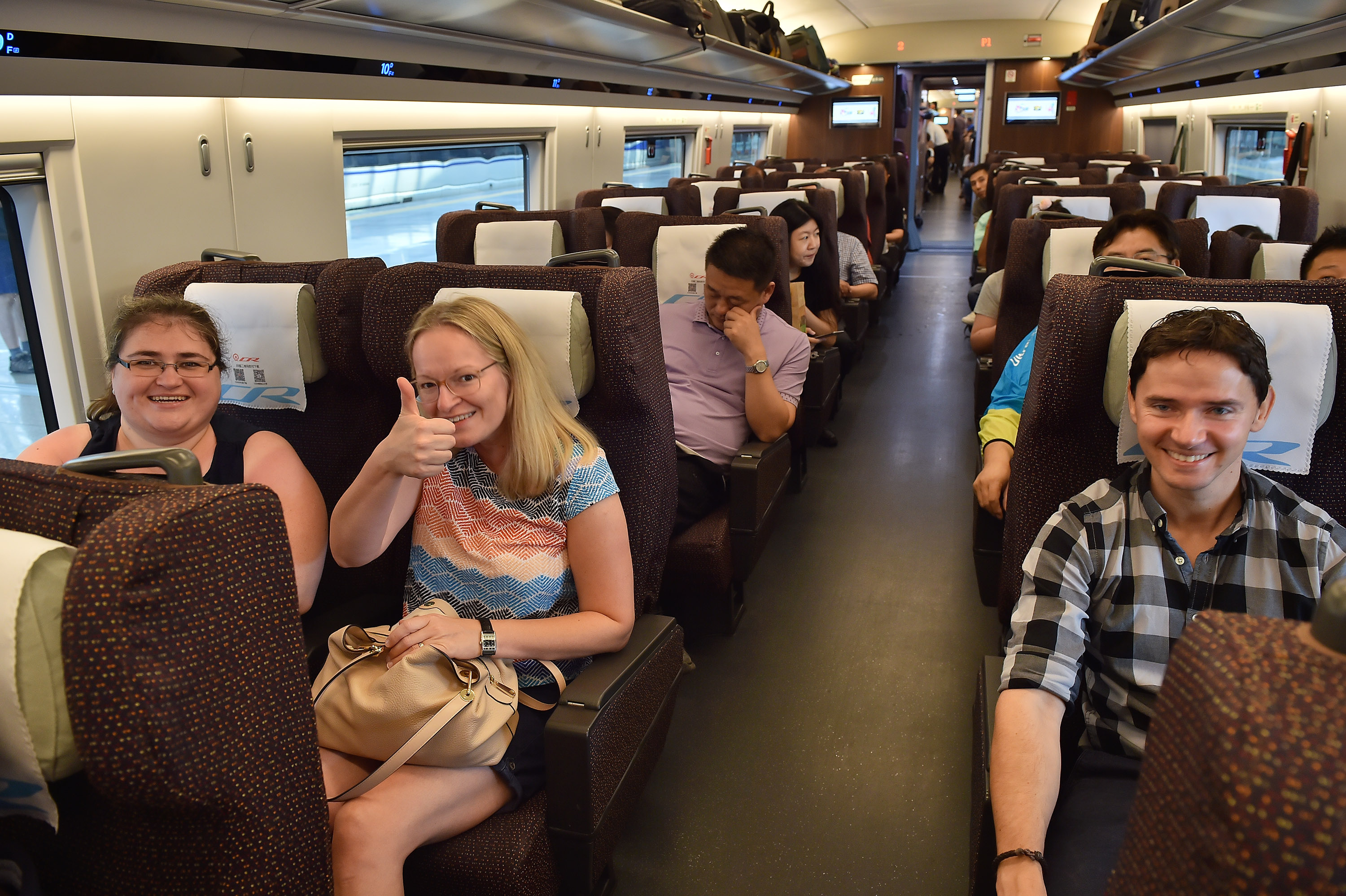 ↑7月1日,旅客在首趟北京南至上海虹桥G7次长编组“复兴号”动车组列车上等待发车。新华社记者张晨霖摄