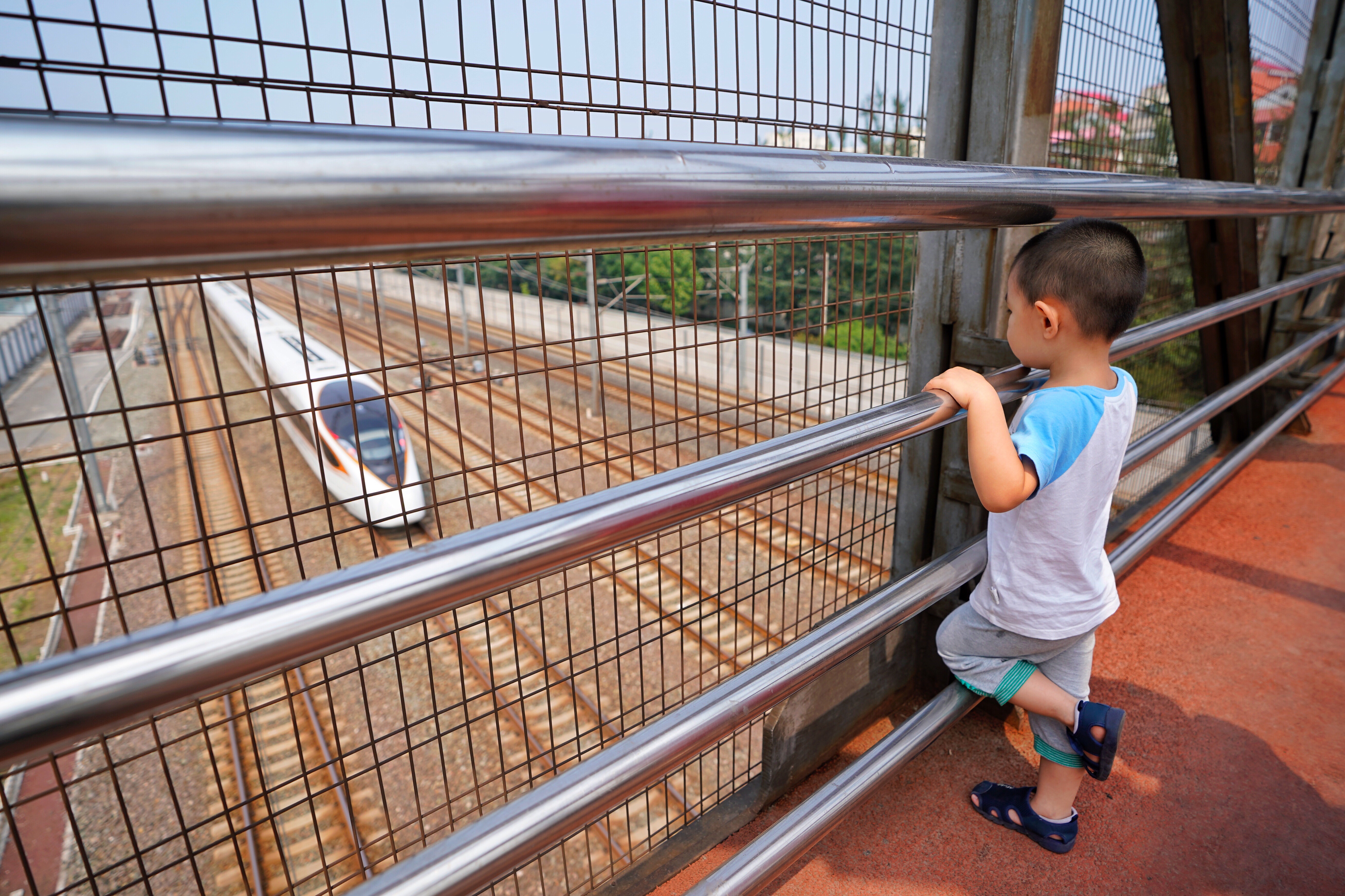 ↑7月1日,整备好的G7次列车驶向北京南站,准备发往上海。此列G7列车是从北京开出的首趟正式运营的长编组“复兴号”动车组。新华社记者邢广利摄