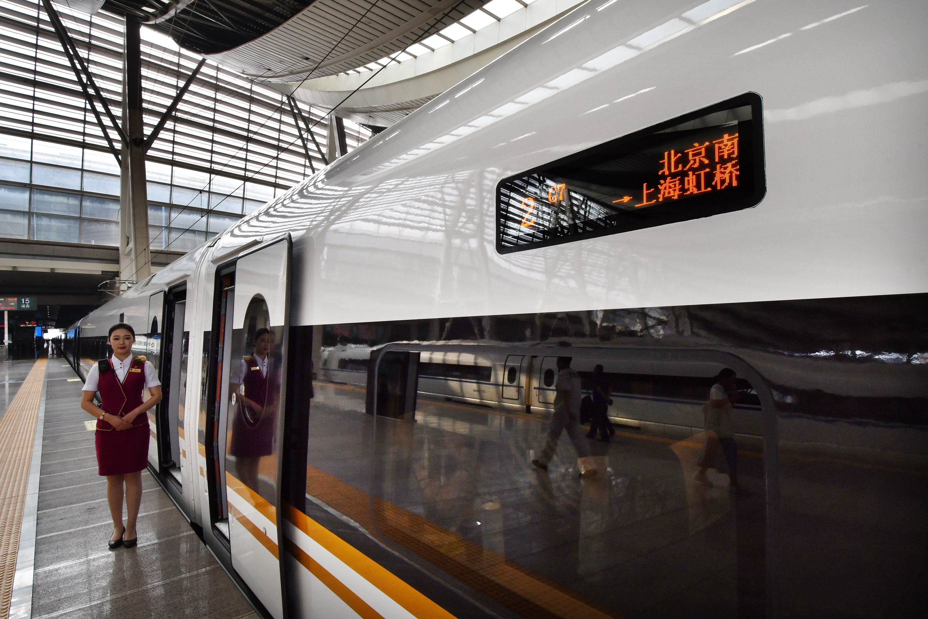 ↑7月1日,首趟北京南至上海虹桥G7次长编组“复兴号”动车组列车等待发车。新华社记者张晨霖摄