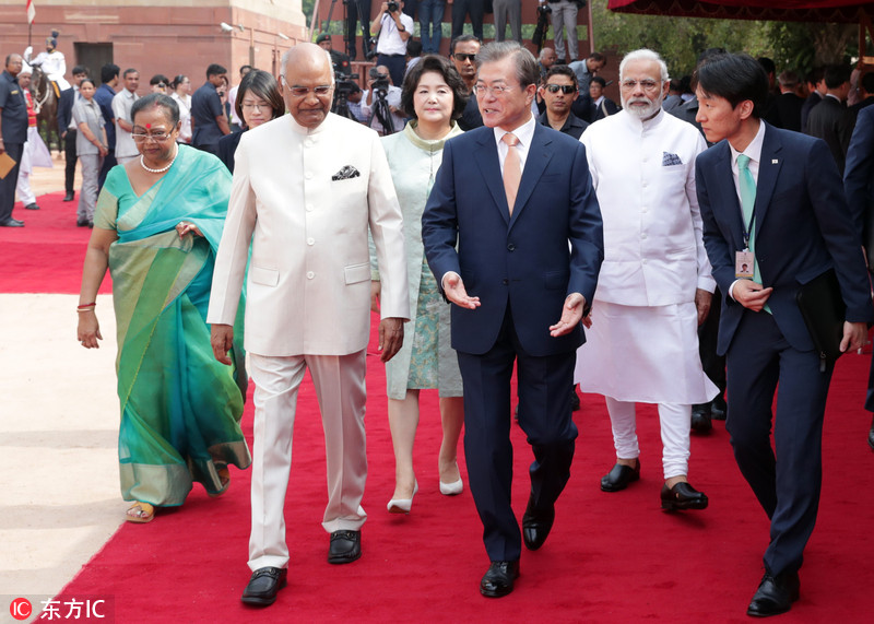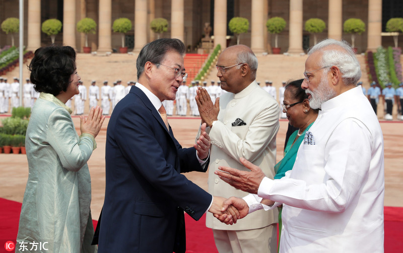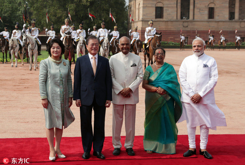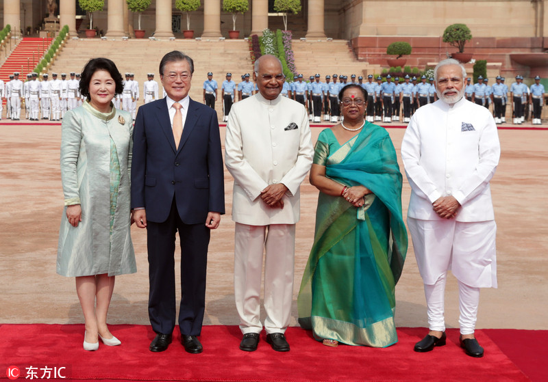当地时间2018年7月10日,印度新德里,印度总统考文德夫妇、总理莫迪在总统府为来访的韩国总统文在寅夫妇举行欢迎仪式。