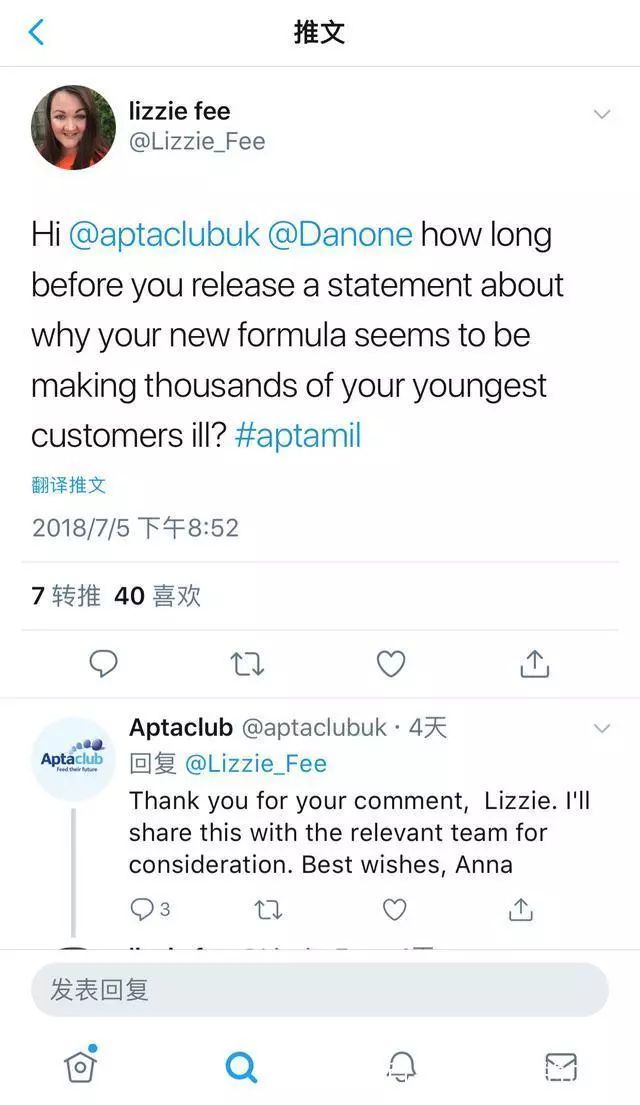 ▲网友Lizzie Fee: 嗨@aptaclubuk @Danone要多久你才发布声明,说明为什么你的新配方似乎让数以千计的你年龄最小的客户生病?