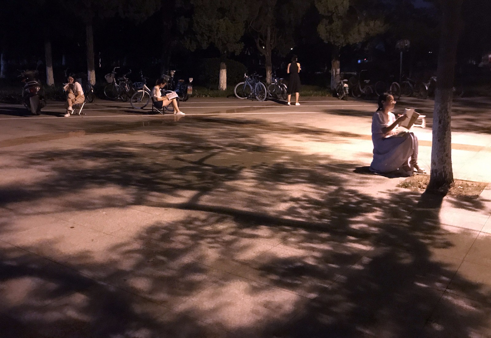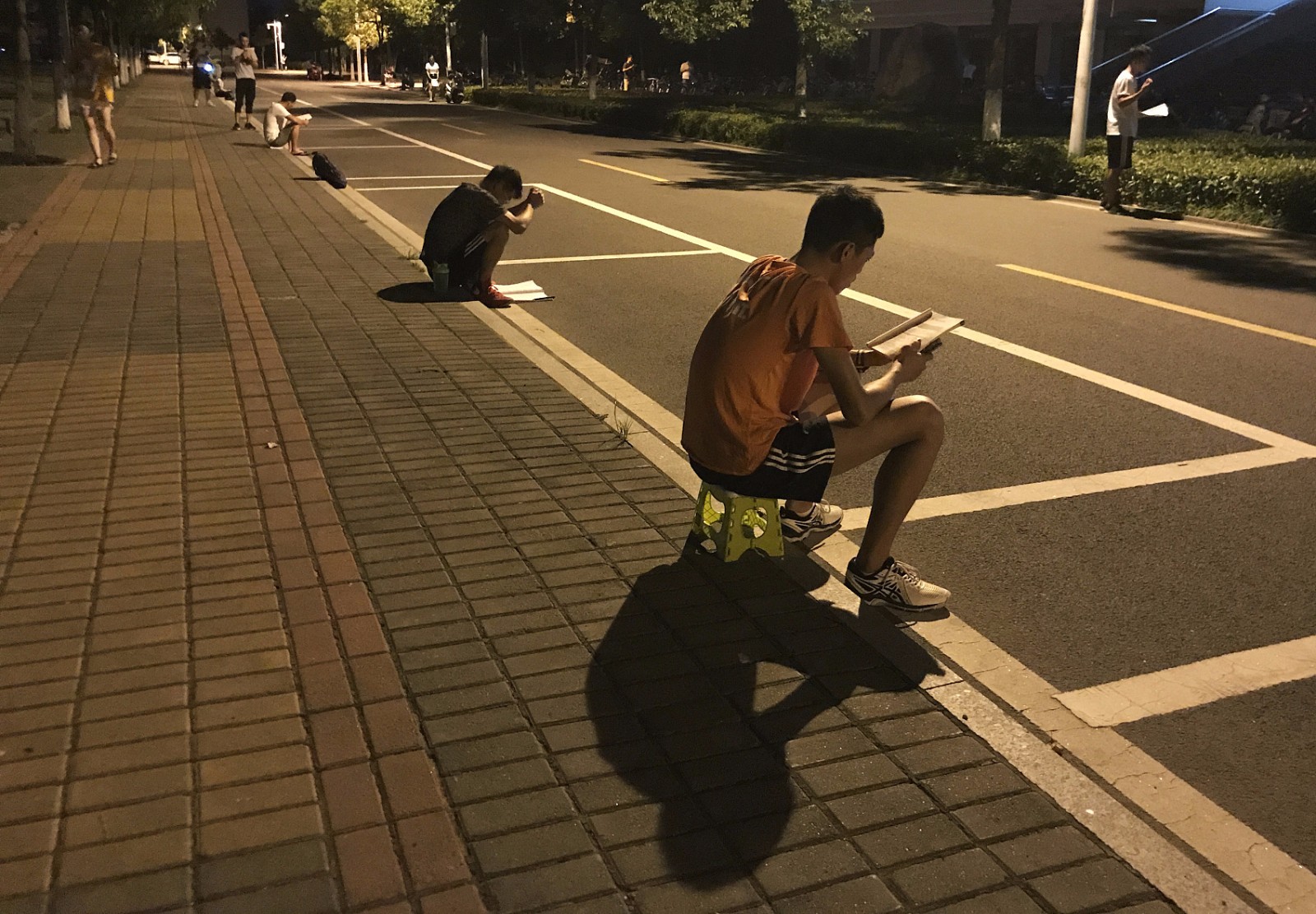 7月20日晚,安徽六安,皖西学院准备考研的大三学生在校园路灯下背书。 许多准备考研的大三学生在路灯下背单词,而可以容纳上千人的图书馆4个大型阅览室,更是挤满了复习考研的学生。(来源:视觉中国)